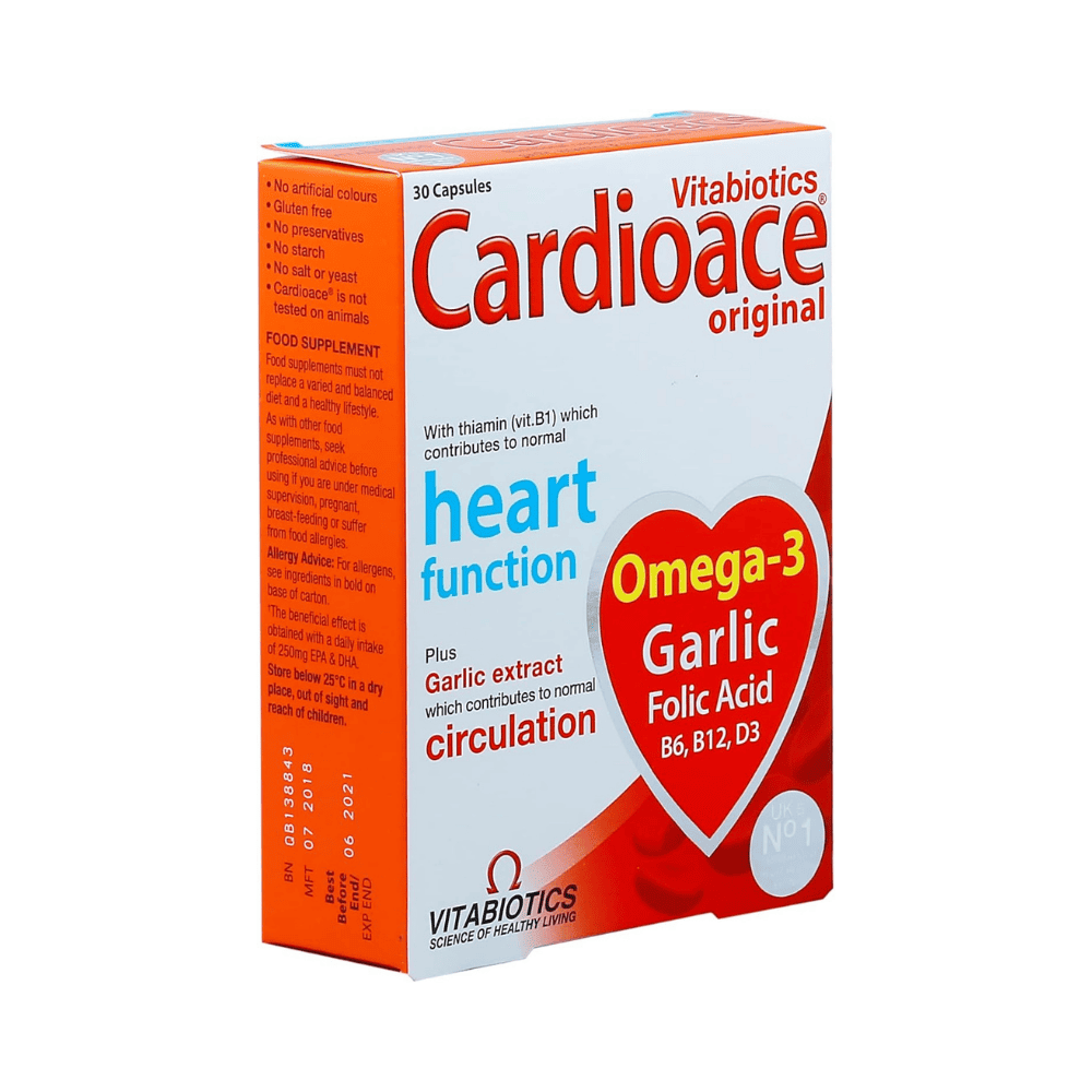 Vitabiotics Cardioace Original Capsules are designed to provide daily nutritional support for the cardiovascular system as part of a balanced lifestyle. This advanced formula combines heart-beneficial nutrients including omega-3 fatty acids (EPA and DHA), coenzyme Q10 (CoQ10), vitamin D3, magnesium, vitamin K2, and other supportive micronutrients that contribute to normal heart health and circulation.