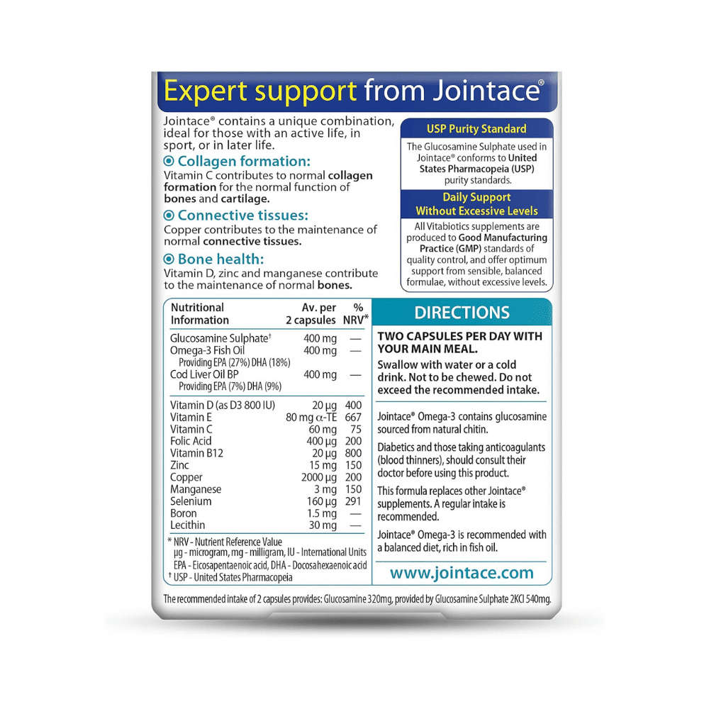 Vitabiotics Jointace Omega-3 is a specialised nutritional supplement formulated to support joint health and overall wellbeing through a potent combination of omega-3 fatty acids (EPA and DHA) and complementary nutrients. Omega-3s contribute to the normal function of joints and connective tissues by helping support flexibility and comfort, especially for those with an active lifestyle or joint-related concerns.