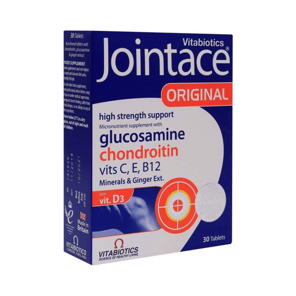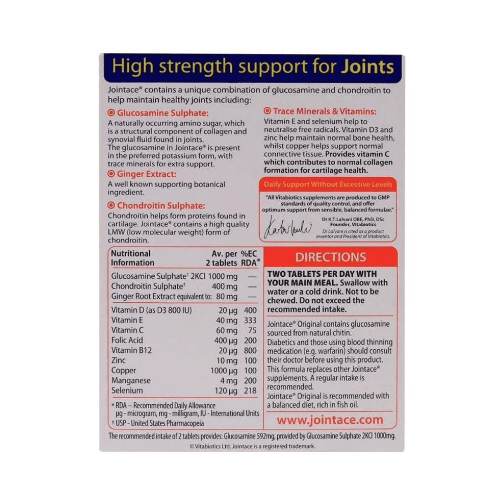 Vitabiotics Jointace Original High Strength is a high-potency joint formula designed to support the health of joints and connective tissues. This advanced supplement combines glucosamine hydrochloride, MSM (methylsulfonylmethane), chondroitin sulfate, and supportive nutrients such as vitamin C and zinc to help maintain normal joint cartilage structure, flexibility, and comfort as part of an active lifestyle.