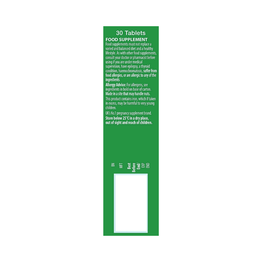 The formula includes important nutrients such as folic acid, which contributes to maternal tissue growth and early foetal development; iron, which supports normal red blood cell formation and reduces tiredness and fatigue; vitamin D for bone and immune health; and zinc, which plays a role in fertility and reproductive function. Additional B-vitamins help with energy release and metabolism, while antioxidants like vitamins C and E support cellular health.
