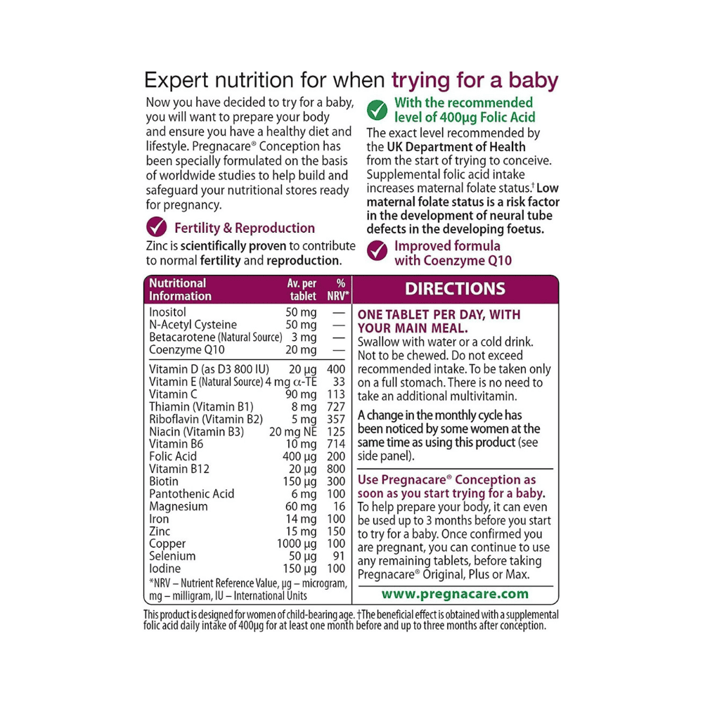 Pregnacare Conception is intended for use before and during the early stages of pregnancy to help ensure optimal nutrient status when trying to conceive. Always read the label and follow the recommended dosage instructions. Consult a healthcare professional before use if you are under medical supervision or have specific dietary or health concerns.