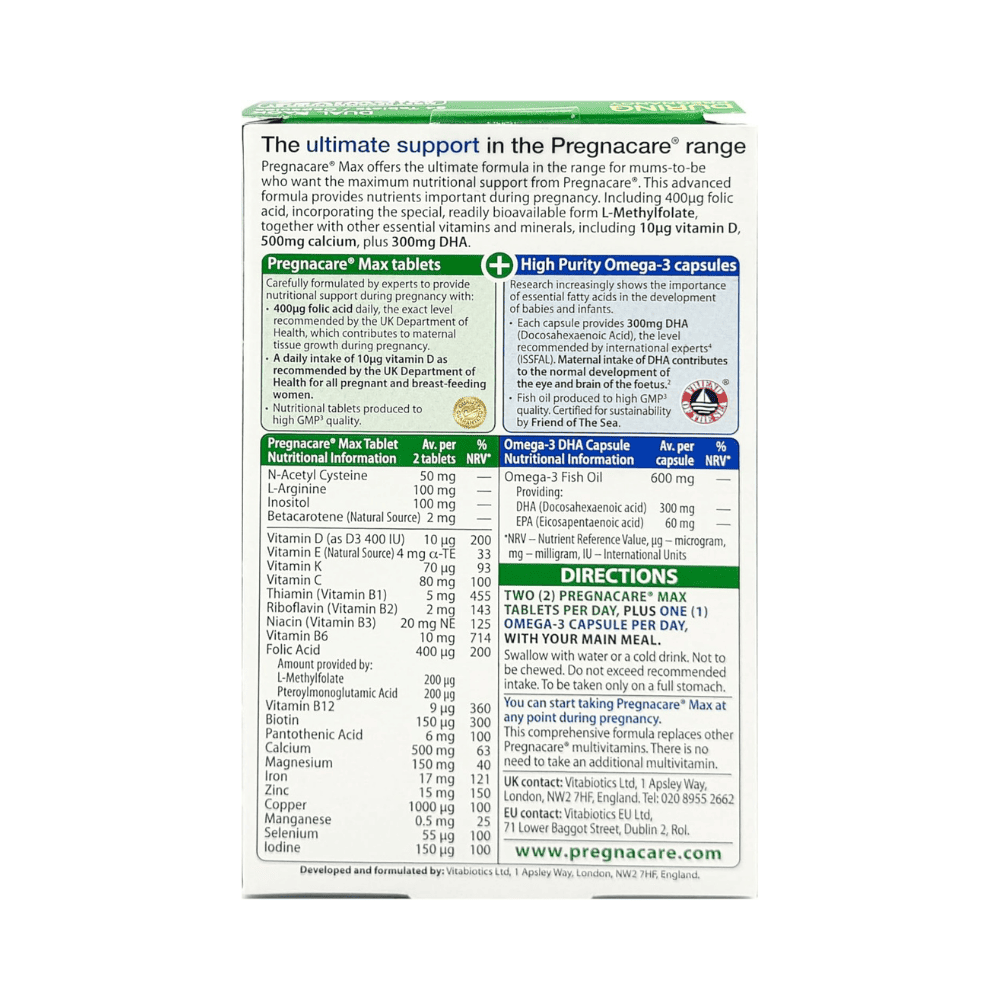 The formula features a broad spectrum of nutrients including high levels of folic acid, iron, vitamin D, calcium, zinc, B-complex vitamins, and other trace elements that contribute to normal energy release, immune function, red blood cell formation, and healthy bone development. Pregnacare Max may also contain additional supportive ingredients tailored to support overall nutritional needs throughout pregnancy and early motherhood.