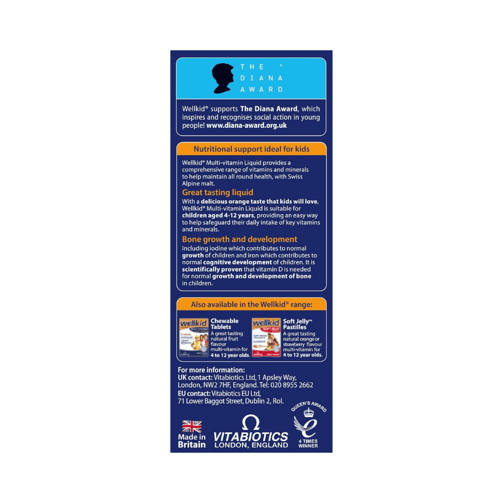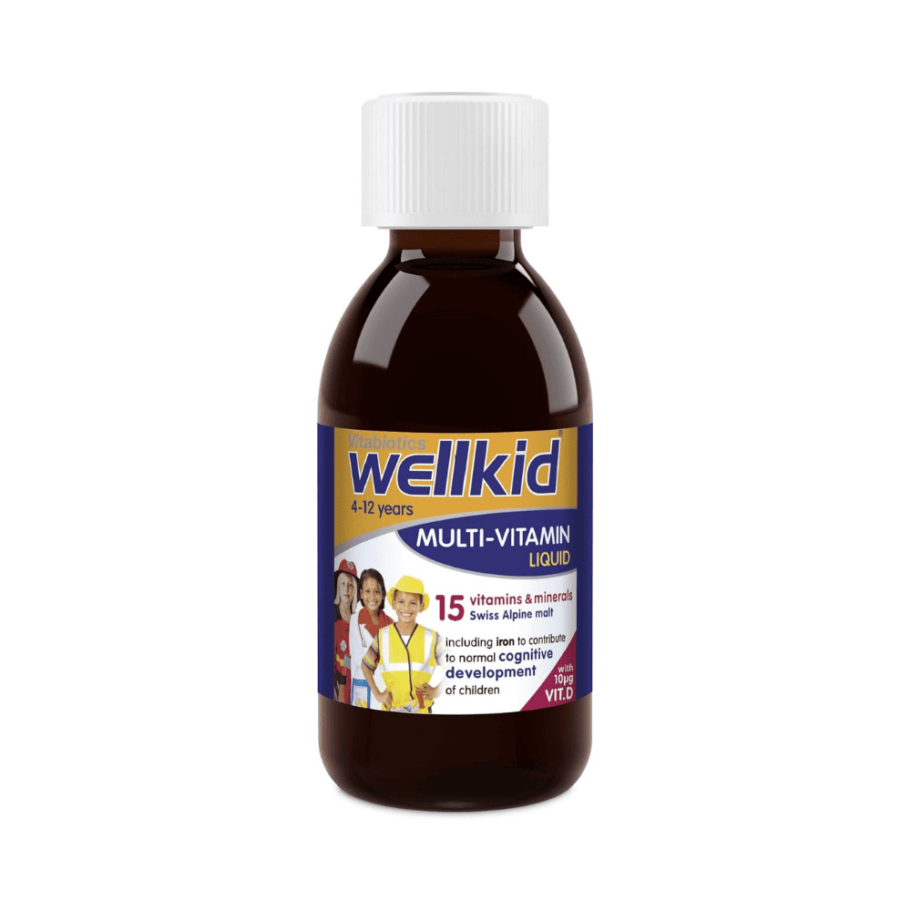 Vitabiotics Wellkid Multivitamin Liquid is a carefully formulated liquid nutritional supplement designed to provide essential vitamins, minerals, and trace nutrients for growing children. Ideal for children who may have dietary gaps or increased nutritional needs, this easy-to-administer liquid delivers vitamins A, C, D, B-complex, and important minerals in a palatable form that makes daily supplementation simple.