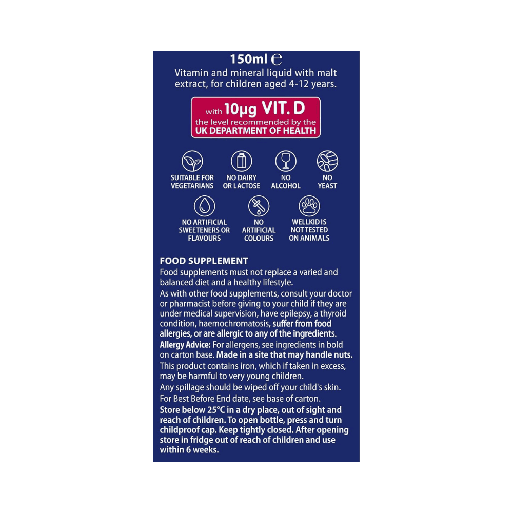 Wellkid Multivitamin Liquid is free from artificial colours and unnecessary additives. Always follow the recommended dosage instructions and consult a healthcare professional if your child has specific health or dietary concerns.